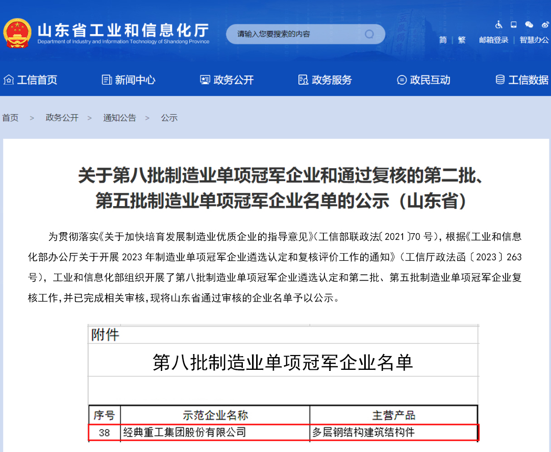 近日,工業(yè)和信息化部第八批制造業(yè)單項冠軍示范企業(yè)名單公示,經(jīng)典重工集團股份有限公司位列其中,是該榮譽歷批次認定中唯一一家建筑鋼結構行業(yè)民營企業(yè)。