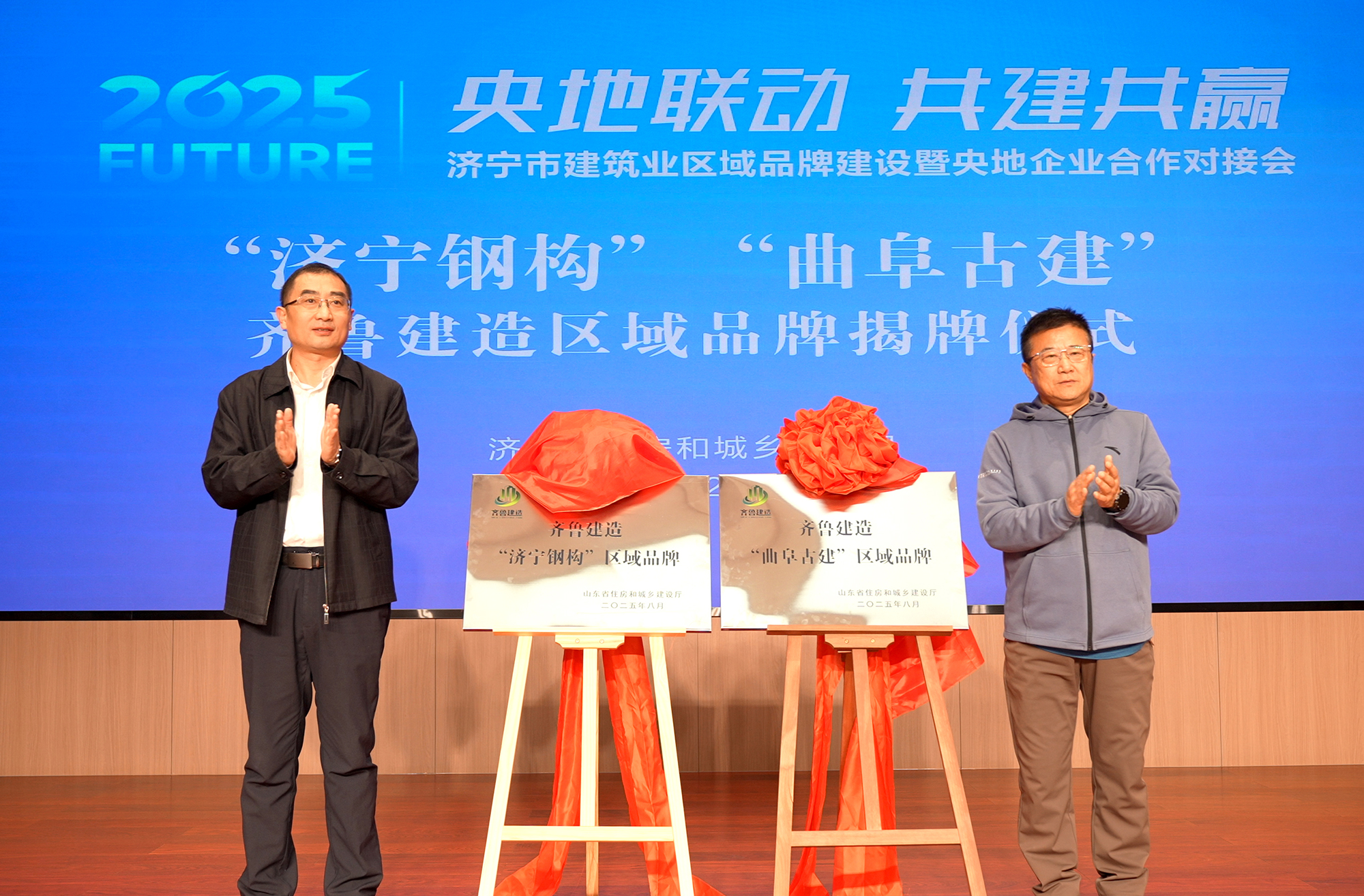 市住建局李振副局長、市建筑業協會郭志明會長共同為“濟寧鋼構”“曲阜古建”齊魯建造區域品牌揭牌