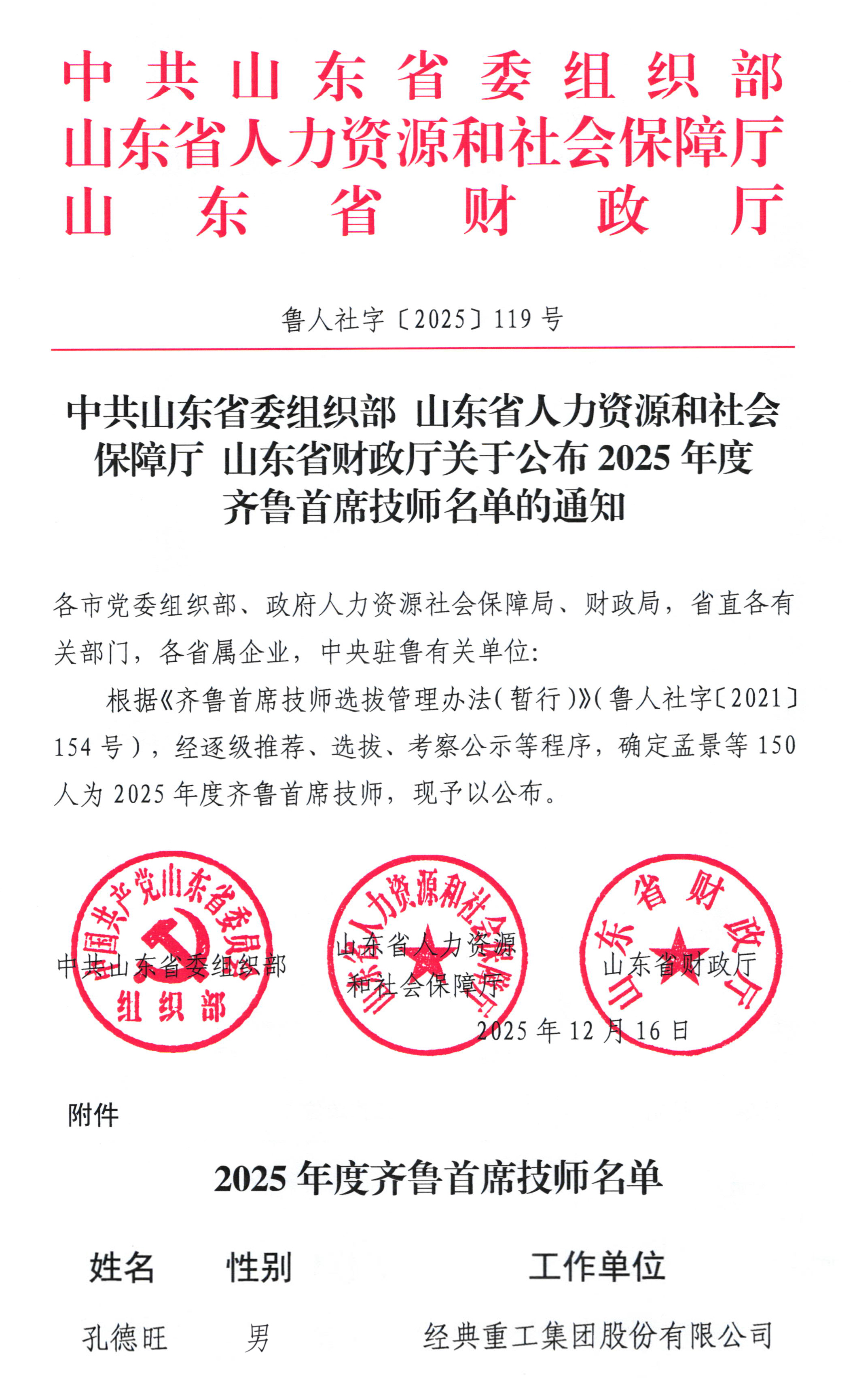 近日,山東省人力資源和社會保障廳正式公布 2025 年齊魯首席技師名單,優(yōu)秀共產黨員、高級技師孔德旺榮耀入選,經典工匠再度獲得省級技能領域這一重磅殊榮,彰顯了企業(yè)人才培育的深厚積淀與卓越成效。
