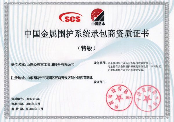 經典集團喜獲中國金屬圍護系統承包特級資質