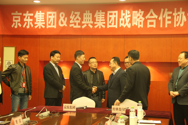 3月28日,京東集團與經典集團戰略合作簽約儀式在圣德國際酒店會議中心舉行。京東集團山東大區總經理張迎新與經典集團董事長苗樹文共同簽署了投資5億元建設集線上電商服務平臺、線下體驗商城為一體的綜合電商服務平臺項目。