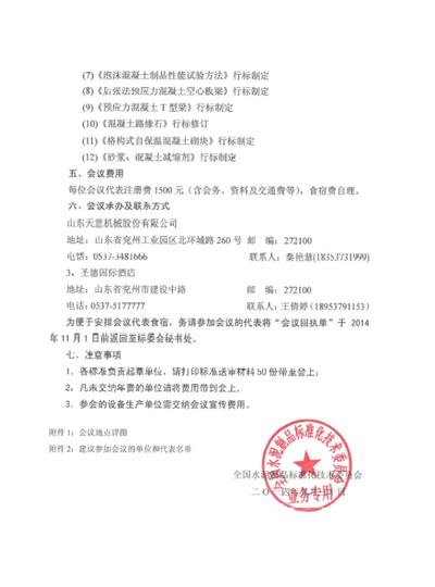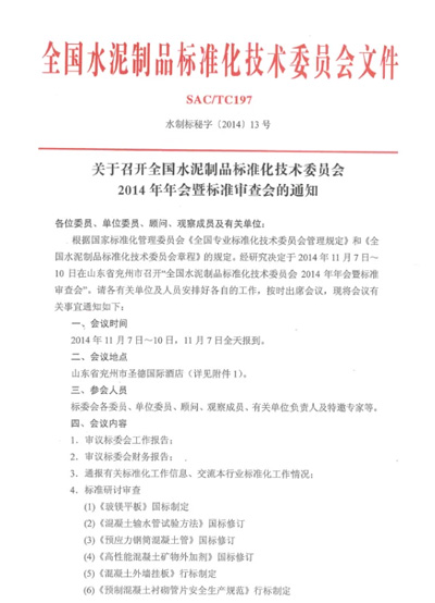 11月7日-9日全國水泥制品標(biāo)準(zhǔn)化技術(shù)委員會2014年年會暨標(biāo)準(zhǔn)審查會在山東天意機械股份有限公司隆重召開。屆時,委員會相關(guān)領(lǐng)導(dǎo)及行業(yè)相關(guān)科研人員將蒞臨會議,共同商討制訂行業(yè)有關(guān)標(biāo)準(zhǔn)。誠邀各界人士屆時蒞臨天意機械、經(jīng)典集團(tuán)、卓越精工參觀指導(dǎo)。
