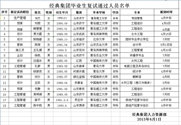 經(jīng)典集團(tuán)畢業(yè)生復(fù)試通過(guò)人員名單