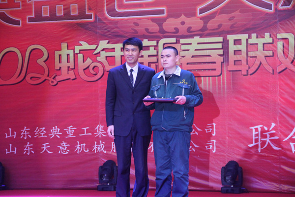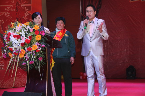 公司領導為年會特等獎獲得者頒發獎品(聯想手提電腦一臺)